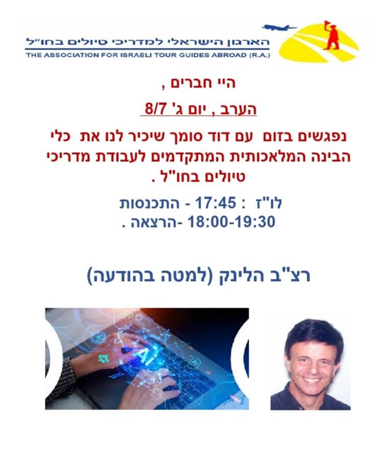 8/7/2025 – הרצאה בזום : כלי הבינה המלאכותית למדריכי טיולים בחו"ל / דוד סומך